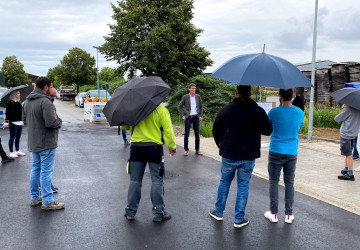 Herzliche Einladung in das neue Gewerbegebiet. Der Vorsitzende des Gewerbevereins Jens Weber und Bür...